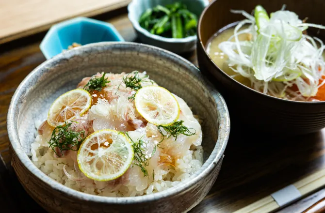 朝食は、魚と出汁をテーマにした甚六朝市食堂で、こだわりの食材と、その日とれたての恵みを。