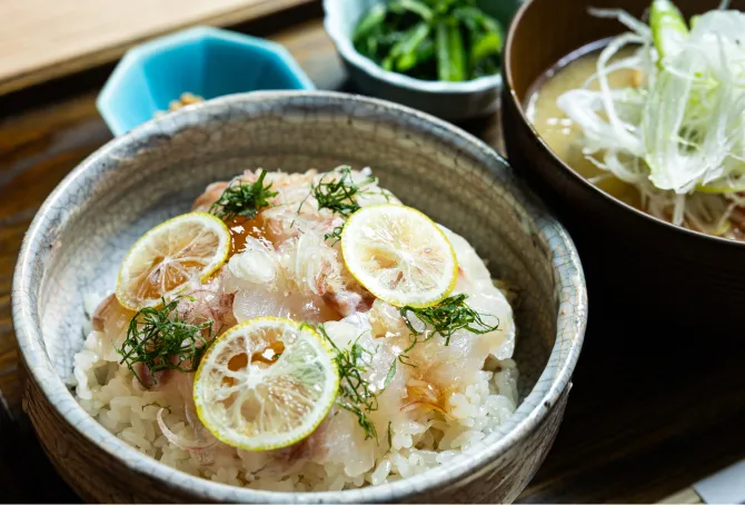 「魚と出汁」をテーマにした呼子甚六食堂。漁師の朝ごはんにならい、地元で獲れた鮮魚や旬の食材を使って、心も体も活きる料理をお届けします。唐津焼の器とともに、呼子の地域文化を味わえる場です。