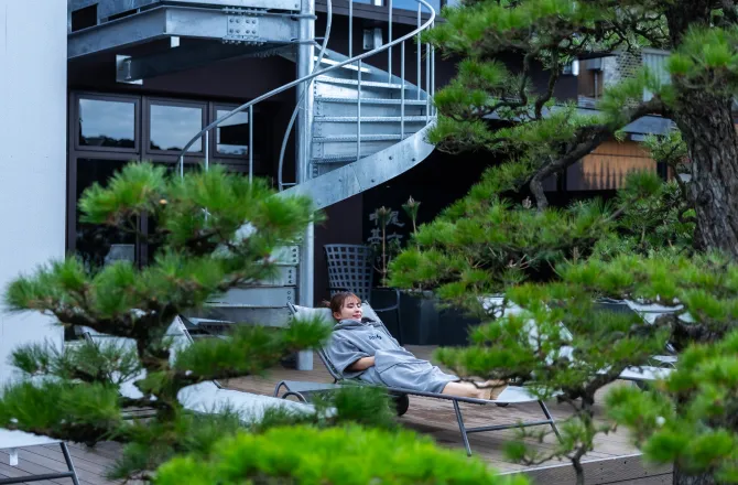 鯨サウナやイカサウナなど個性豊かな設えや、空と一体になる水風呂、海景を一望できるデッキ。かつて鯨漁を前に繰り広げられた祭りや酒盛りの熱気を感じさせる、ここにしかないディープな体験を届けます。